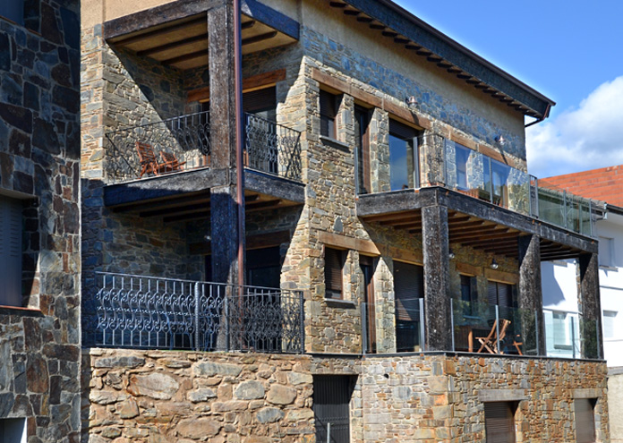 La edificación está hecha de materiales nobles, de piedra y madera por fuera, además de pizarra en el tejado. Los interiores, también de materiales nobles, disponen de amplias cristaleras que dan al valle del río y cuentan con sus respectivas terrazas. Su alta calidad les otorgan una categoría de 4 estrellas.