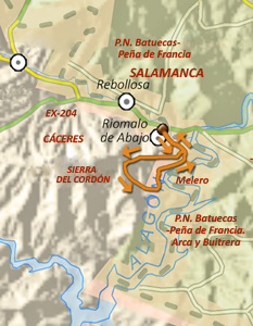 Resumen de la ruta: El recorrido va desde el CTR Riomalo hasta el Mirador de la Antigua para contemplar el meandro más conocido del Alagón, el Melero. Realiza la ida ascendiendo por una vía de extinción de incendios; las panorámicas sobre las sierras de Las Hurdes y del Parque Natural de las Batuecas - Peña de Francia, del Alagón y del embalse de Gabriel y Galán son impresionantes. Al descender, comienza el retorno a Riomalo de Abajo pasando por el Mirador.