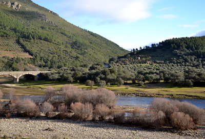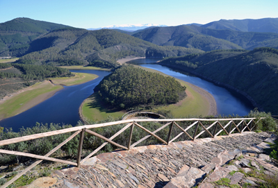 Resumen de la ruta: El recorrido va desde el CTR Riomalo hasta el Mirador de la Antigua para contemplar el meandro más conocido del Alagón, el Melero. Realiza la ida ascendiendo por una vía de extinción de incendios; las panorámicas sobre las sierras de Las Hurdes y del Parque Natural de las Batuecas - Peña de Francia, del Alagón y del embalse de Gabriel y Galán son impresionantes. Realiza la vuelta de forma diferente a la ruta 1, por la llamada Verea de los Pescadores, una bellísima senda abierta por encima del Melero y por debajo del Mirador de la Antigua que llega a tocar la orilla del Alagón.